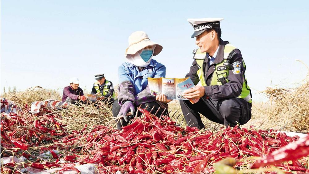 民警在田間地頭向群眾講解交通安全知識。近日,高臺縣公安局交通管理大隊駱駝城交警中隊民輔警通過發(fā)放宣傳資料、以案釋法、與村民面對面交流等方式,宣傳道路交通安全法律法規(guī),維護(hù)好豐收季節(jié)農(nóng)村道路交通秩序。新甘肅·甘肅法治報通訊員 蔣雯麗 攝