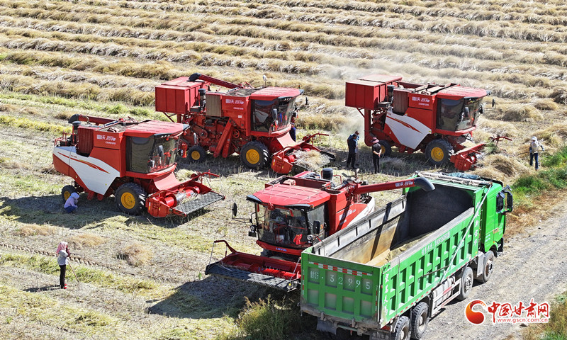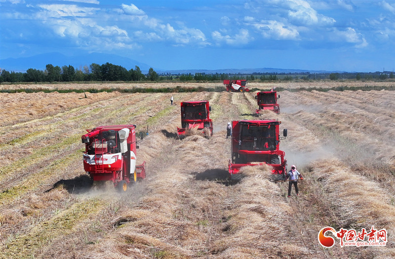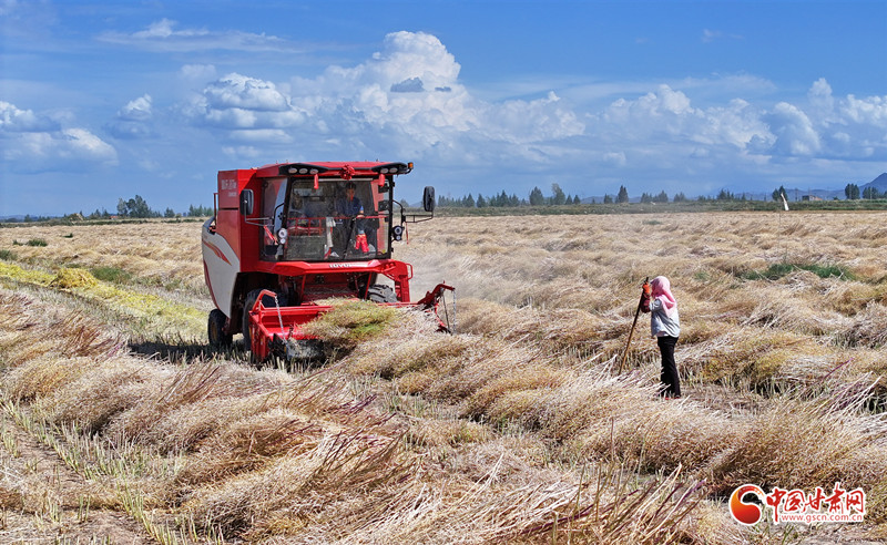 8月24日,在民樂縣新天鎮(zhèn)韓營(yíng)村千畝油菜種植基地,村民駕駛農(nóng)機(jī)在田間開展油菜籽搶收作業(yè)。
