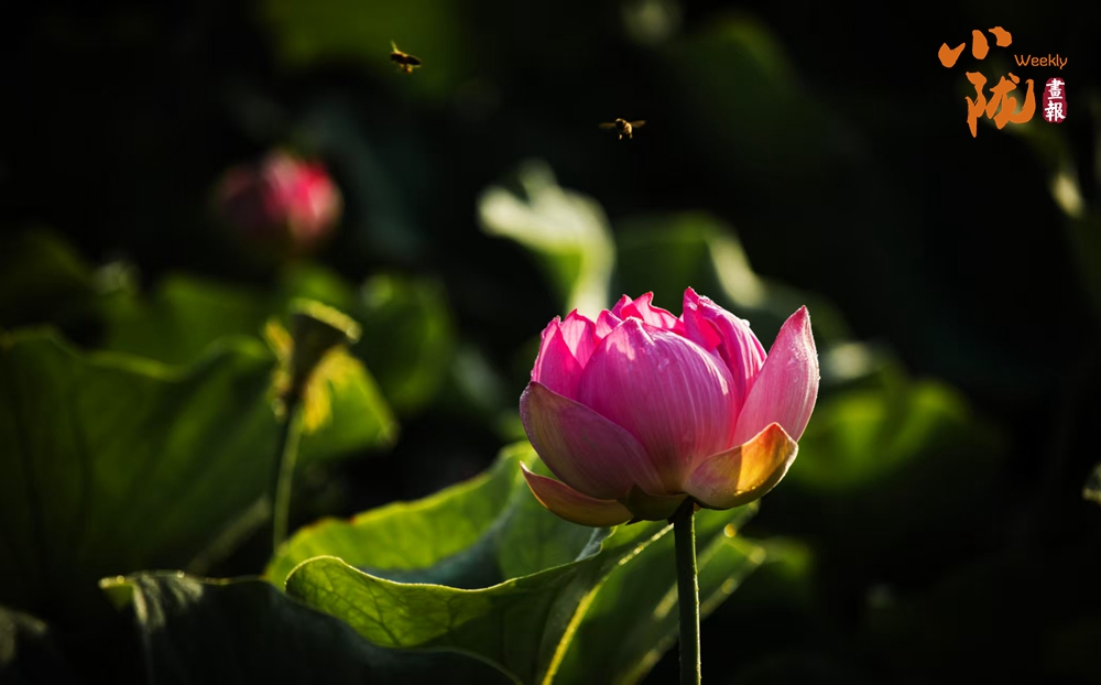 荷花成片盛開,偶有蜜蜂飛來飛去,時而駐足在花苞尖上,時而又快速飛向另一朵荷花,構成了一幅靈動的“蜜蜂戲荷圖”。水中的魚兒也不甘寂寞,穿梭在荷葉間,偶爾躍出水面,濺起朵朵水花,為這靜謐的荷塘增添了幾分生機。