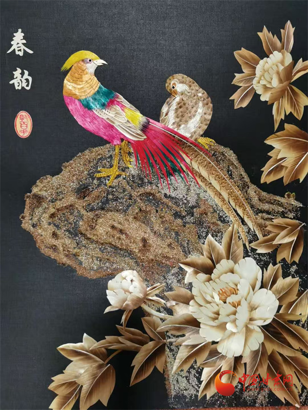 多年打磨后,郭百花走出了獨(dú)特的創(chuàng)作之路——以拼貼手法為主,讓作品更具層次感與立體感。在她十幾平米的“百花麥稈藝術(shù)工作室”里,《春韻》勾勒出江南詩意,《敦煌文旅》再現(xiàn)絲路風(fēng)情,《孔雀戲牡丹》盡顯雍容華貴,而《錦上添花》中,小鳥的羽毛竟由細(xì)如發(fā)絲的麥稈剪貼而成,市場價(jià)達(dá)1500元左右。這些作品里,既有山川花鳥的靈動(dòng),更藏著通渭的鄉(xiāng)土記憶,平凡麥稈在她手中徹底“化腐朽為神奇”。