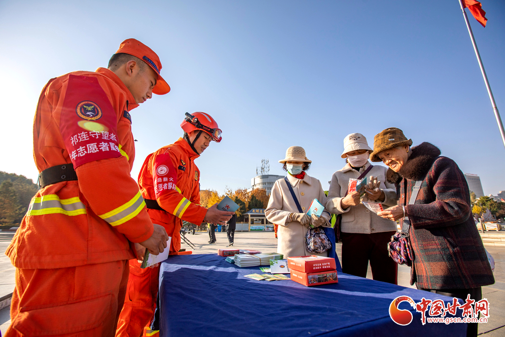消防隊(duì)員向群眾發(fā)放定制消防文創(chuàng)禮品