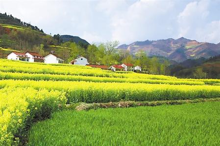 山巒蠢蠢欲動(dòng)起來(lái),卻比不過(guò)一些趕著腳步的植物,或許,它們還要頹敗一些時(shí)日。山腳處的田間,一片片油菜花泛動(dòng)金色的光芒,為山巒繡上彩色的裙邊,散落在田壟之中的農(nóng)舍瓦屋靜默在時(shí)光里,安逸、祥和,讓人向往。