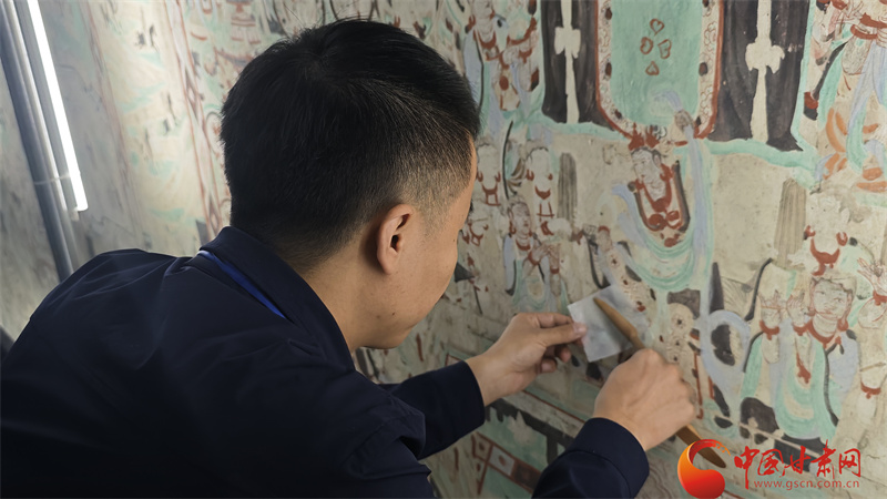 唐青松曾經(jīng)是一名莫高窟講解志愿者,在手電筒的柔和光源之下,他能更清楚看到壁畫里的病害,也更焦急如何更好保護(hù)壁畫,所以當(dāng)有機(jī)會成為壁畫修復(fù)師,他便拿起了保護(hù)工具,用五年時(shí)間傾心學(xué)習(xí),終于有了走進(jìn)洞窟修復(fù)壁畫的機(jī)會。