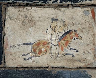 它的“不一般”,首先在于其“極簡卻傳神”的藝術風格。該磚的畫面以赭石色為底,墨線寥寥,卻生動勾勒出一位策馬疾馳的驛使:頭戴魏晉幘帽,身著右衽短衫,左手控韁,右手舉著文書。而駿馬則四蹄騰空,動態(tài)感十足,一種風馳電掣的緊迫感似從畫中撲面而來。更耐人尋味的是,畫師刻意省略了驛使的嘴巴:這一“殘缺”設計,并非疏忽,而是古人智慧的體現(xiàn),象征著郵驛制度中“守口如瓶”的保密原則,使其成為中國古代信息保密文化的生動見證。