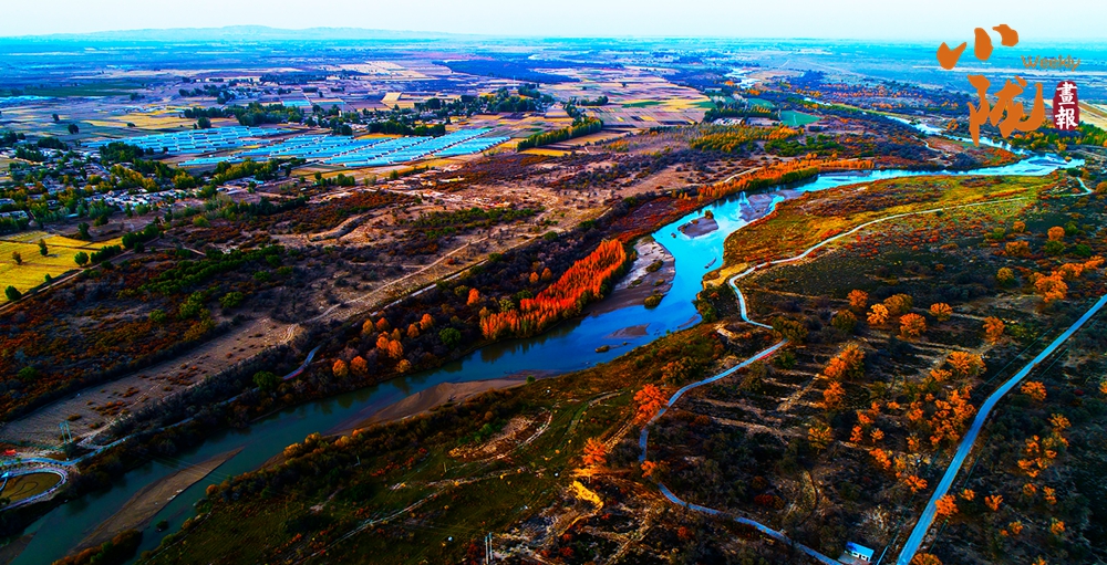 金色胡楊在陽光下泛著溫暖光澤,斑斕絢麗的蘆葦如金色絲帶點綴荒漠,與碧綠河水、湛藍天空構(gòu)成濃墨重彩的秋日圖景。