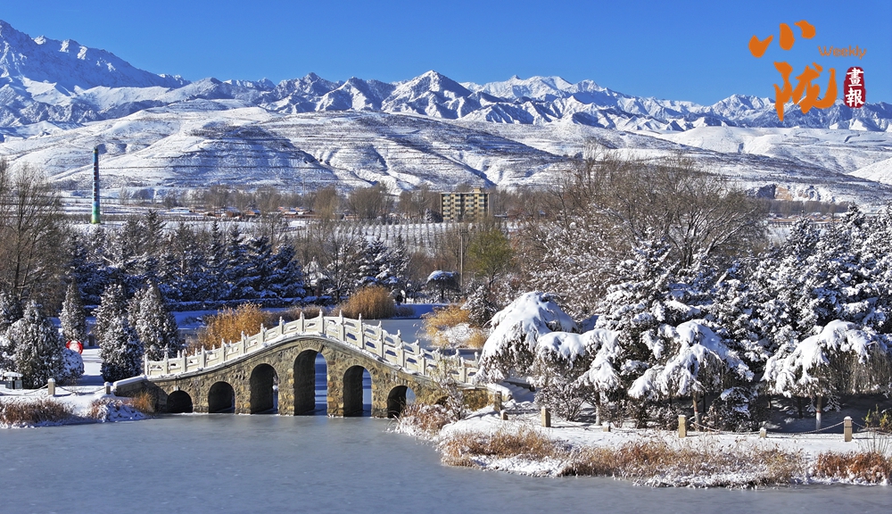 雪后初霽,銀白的民樂公園,在陽光下熠熠生輝,安靜且神秘,與遠(yuǎn)處綿延的祁連山構(gòu)成一幅璀璨的畫卷。